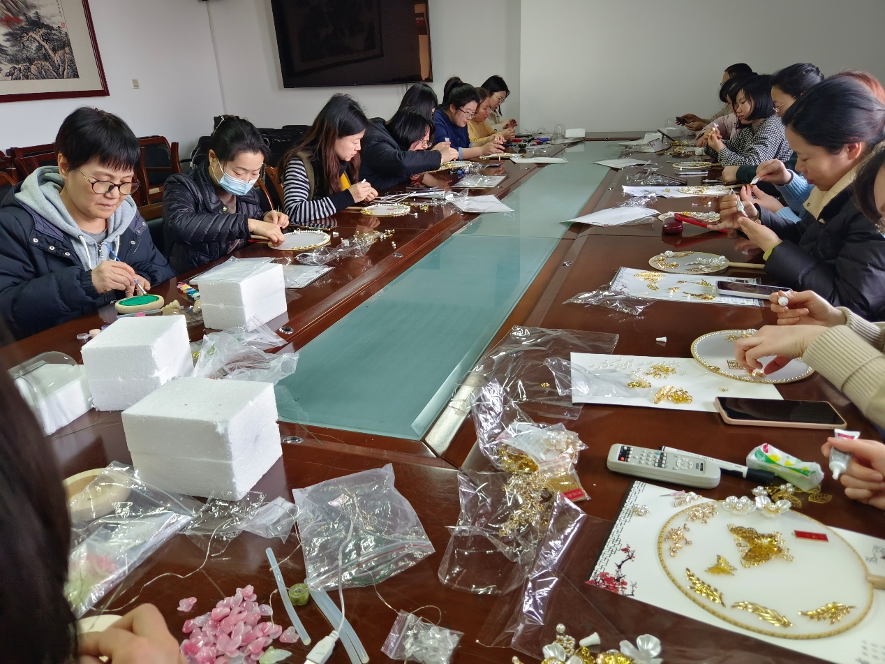 以素面团扇为画布,将串珠、花饰、柳叶等材料精心搭配,或点缀出清雅意境,或点缀出绚烂繁花。大家互相交流,相互帮助,一柄柄团扇或典雅端庄,或灵动活泼,不仅展示了东方韵味,也体现了女性的美好芳华。