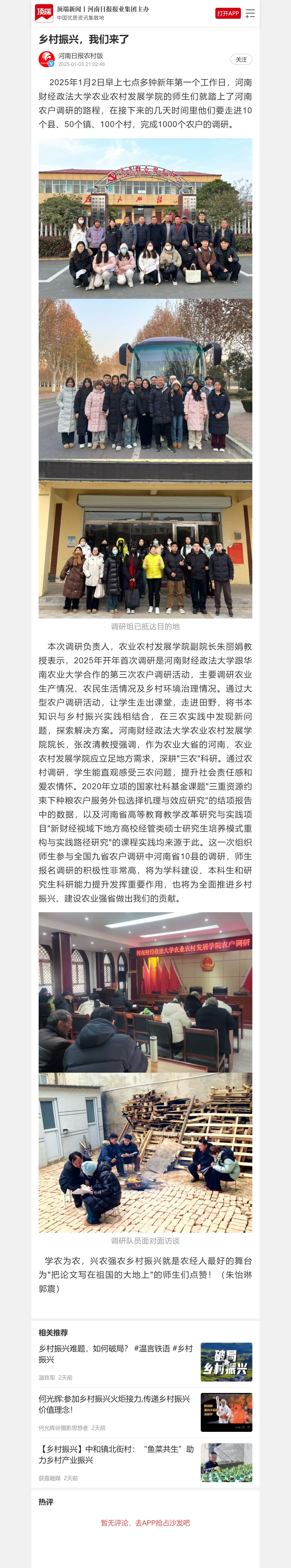 2025年1月2日早上七点多钟新年第一个工作日,河南财经政法大学农业农村发展学院的师生们就踏上了河南农户调研的路程,在接下来的几天时间里他们要走进10个县、50个镇、100个村,完成1000个农户的调研。