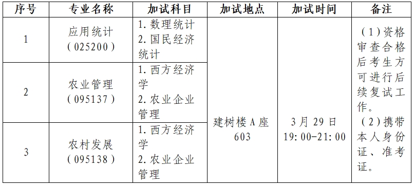同等学力人员加试两门报考专业相关的本科主干课程,均为笔试,每门课程考试时间为60分钟,加试成绩不计入复试总成绩。加试科目、加试时间和地点详见表4。